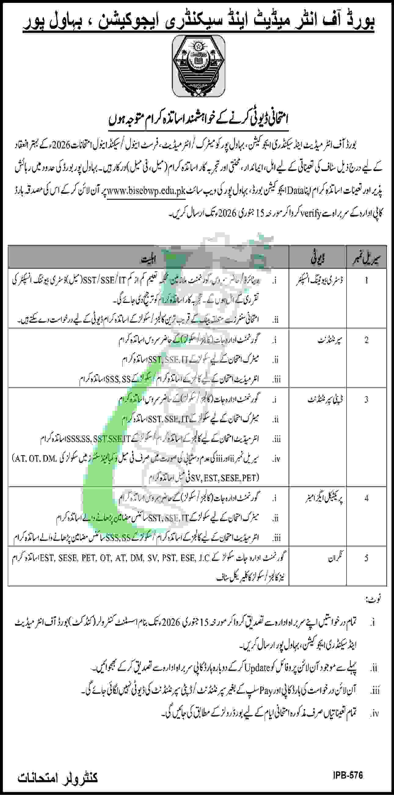 Find BISE Bahawalpur Board Jobs Application Form 2026 Apply Online for the posts named as (Distributing Inspector, Superintendent, Deputy Superintendent, Practical Examiner, Invigilator). Candidates on duty or retired Teachers from government schools / colleges are welcome to apply on the prescribed form with relevant documents to the following address before the closing date 15th January 2026.