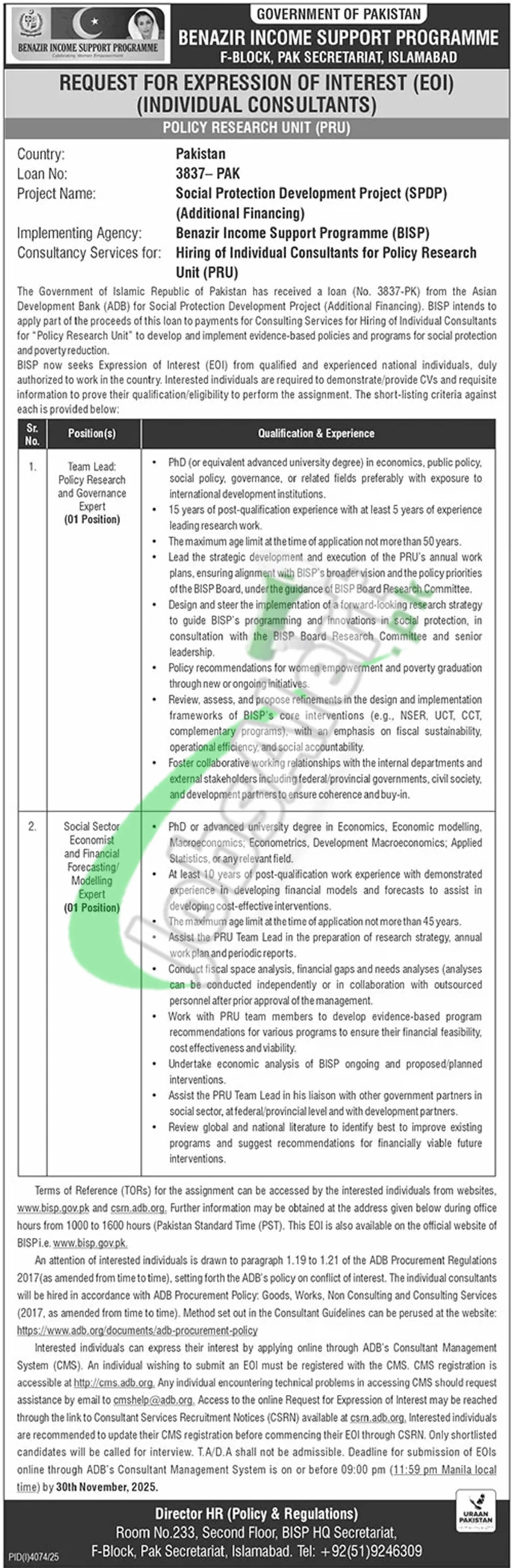 BISP Jobs in Islamabad Online Apply at www.bisp.gov.pk and the posts named as (Team Lead: Policy Research and Governance Expert, Social Sector Economist and Financial Forecasting / Modelling Expert) based at based at Project titled “Social Protection Development Project (SPDP) (Additional Financing). Candidates meeting criteria should apply online before the last date 30th November 2025.