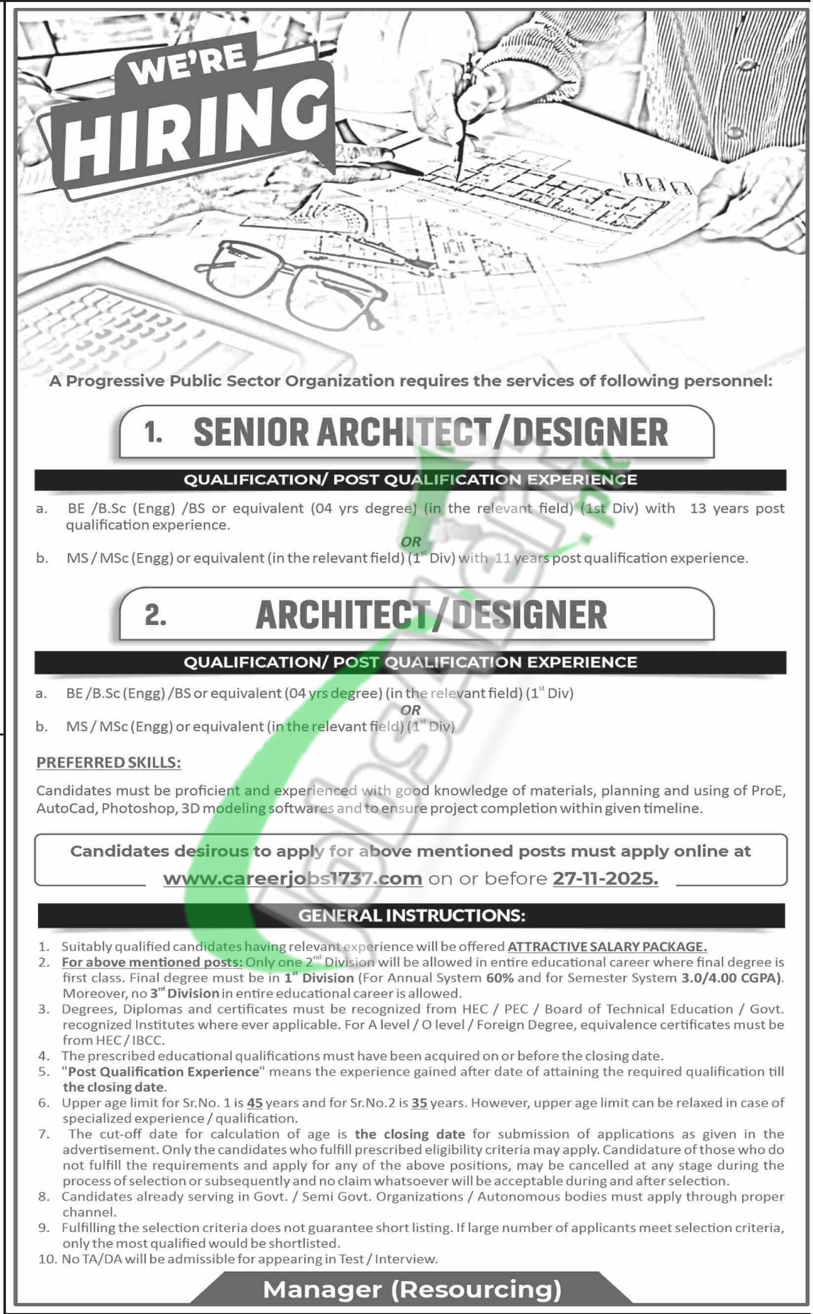 Find www.careerjobs1737.com Jobs 2025 named as (Senior Architect / Designer, Architect / Designer) for which candidates possessing qualification MA / MSc (Engg) / BE / BSc (Engg) / BS or equivalent with 10 to 13 years post qualification experience required to apply online before the last date 27th November 2025.