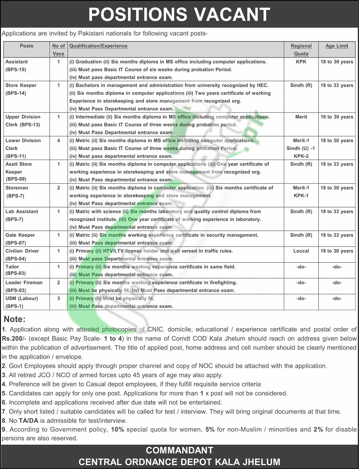 Find Pak Army COD Kala Jhelum Jobs 2026 Application Form Download for the posts named as (Assistant (BPS-15), Store Keeper (BPS-14), UDC (BPS-13), LDC (BPS-11), Assistant Sore Keeper (BPS-09), Storeman (BPS-07), Lab Assistant (BPS-07), Gate Keeper (BPS-07), Civilian Driver (BPS-04), Tailor (BPS-03), Leader Fireman (BPS-03), USM (Labour) (BPS-01)). Candidates possessing qualification Graduation / Intermediate / Matric / Middle with relevant experience holders are welcome to apply before the last date 06th January 2026.