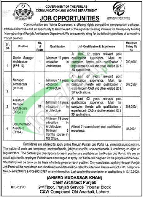 Find C&W Department Punjab Jobs Online Apply 2025 for the announced jobs in the field of Architecture for which qualified and experienced aspirants should apply before the closing date 10th December 2025.