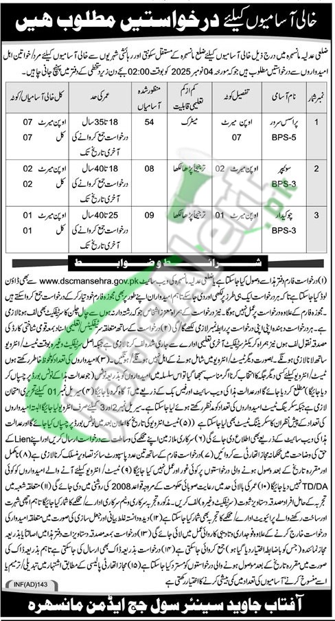 Find Civil Court Mansehra Jobs 2025 Latest Career Opportunities named as (Process Server (BPS-05), Sweeper (BPS-03), Chowkidar (BPS-03)) for which candidates holding qualification Matric / Middle with relevant experience holders are welcome to apply on the prescribed form before the last date 04th November 2025.