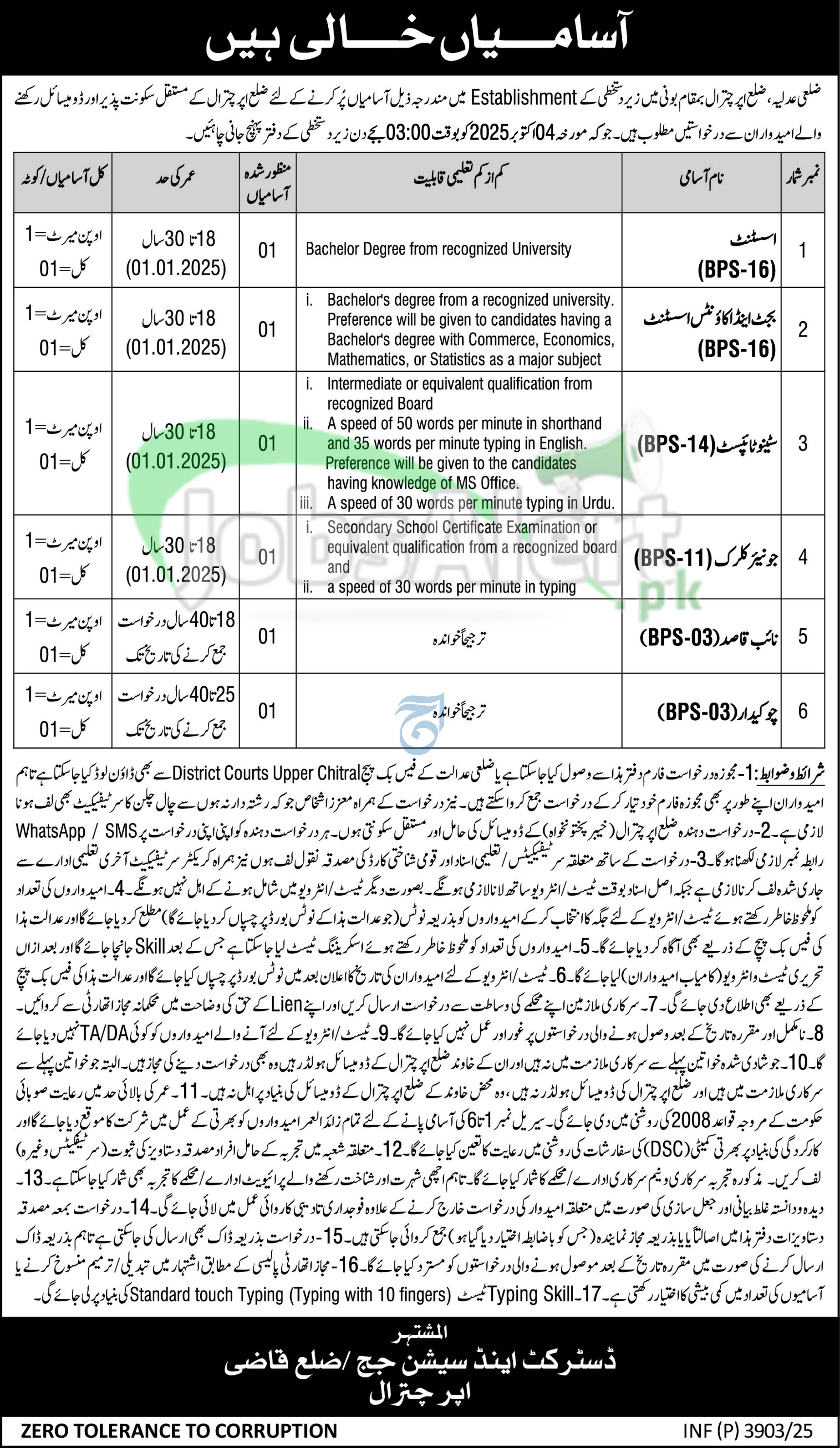 Find Session Court Upper Chitral Jobs 2025 Apply Last Date Today in Pakistan for the posts named as Assistant (BPS-16), Budget and Accounts Assistant (BPS-16), Stenotypist (BPS-14), Junior Clerk (BPS-11), Naib Qasid (BPS-03), Chowkidar (BPS-03). Candidates possessing qualification Graduation / Intermediate / Matric and relevant skills are welcome to apply by submitting handwritten application to the following address before the last date 04th October 2025.