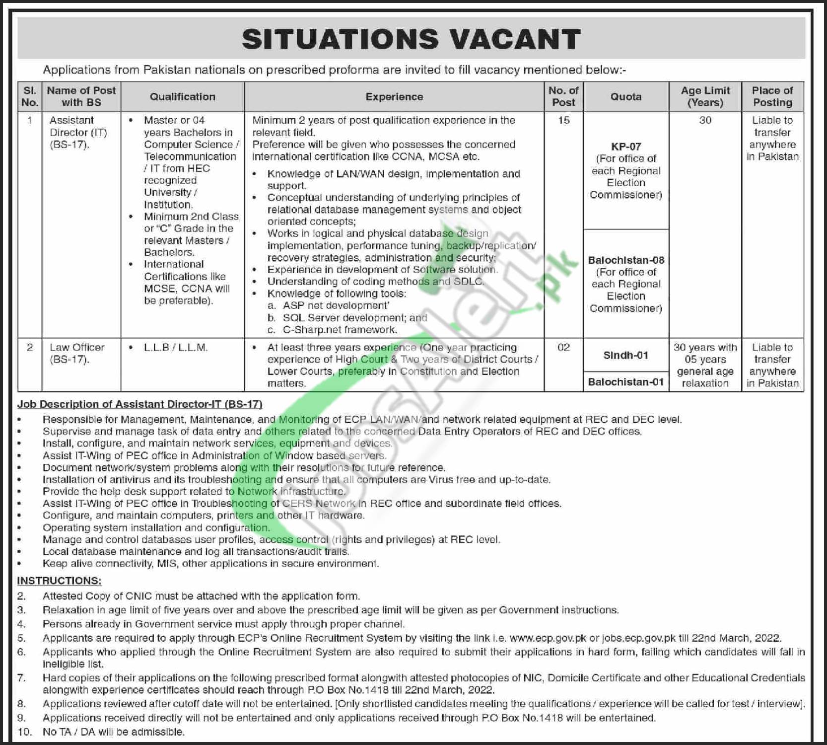 Find PO Box 1418 GPO Islamabad Jobs 2022 ECP Application Form Download for the posts named as (Assistant Director (IT) (BS-17), Law Officer (BS-17)) for which candidates possessing qualification Masters / LLM / LLB with relevant experience holders are welcome to apply online at jobs.ecp.gov.pk or on the prescribed form before the last date 22nd March 2022.