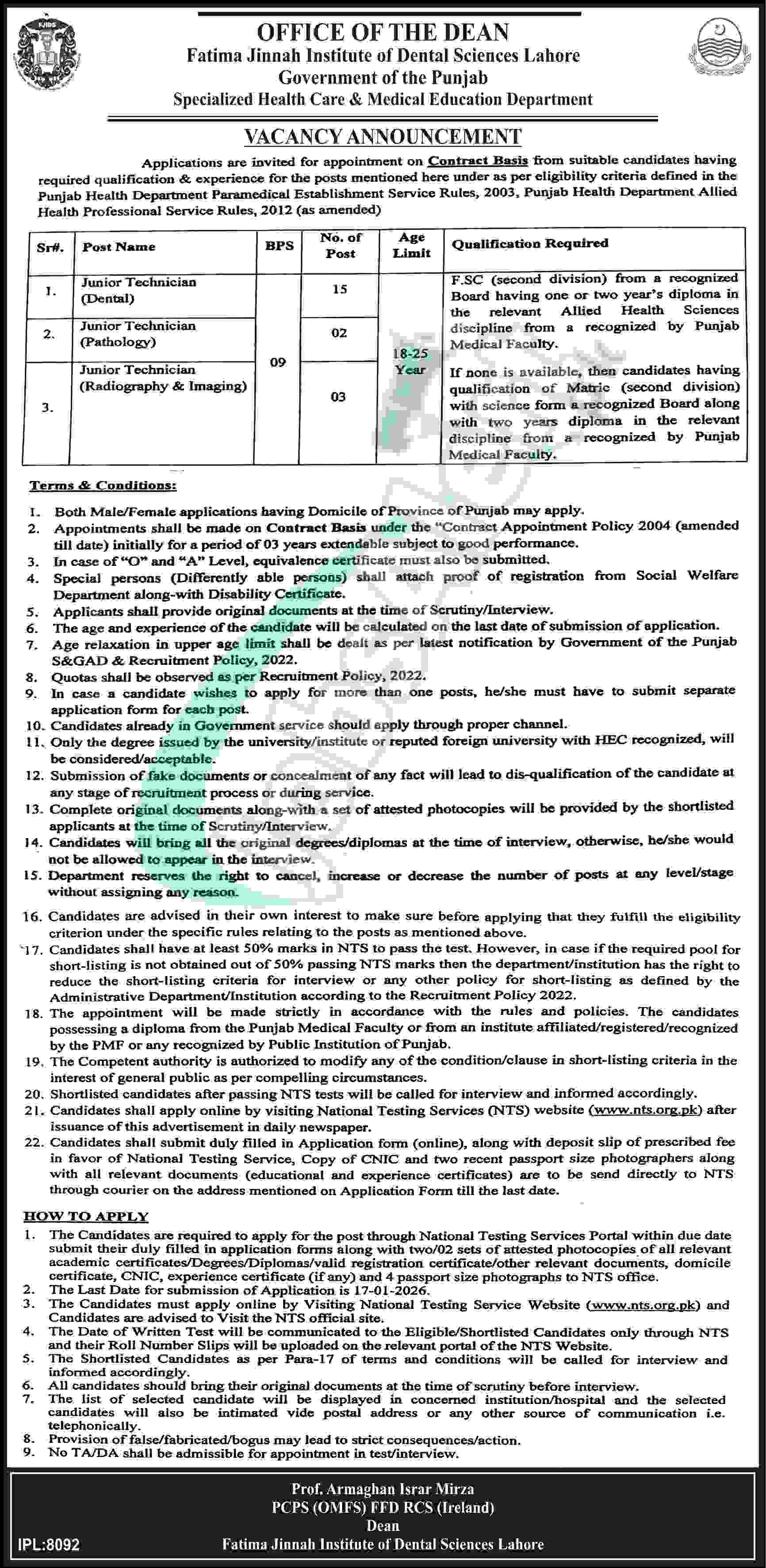 Visit nts.org.pk to Apply in Fatima Jinnah Institute of Dental Sciences Lahore Jobs 2026 and the vacancies to apply are named as (Junior Technician (Dental) (BPS-09), Junior Technician (Pathology) (BPS-09), Junior Technician (Radiography & Imaging) (BPS-09)). Candidates possessing qualification FSc 2nd Division from a recognized Board having one or two year’s diploma in the relevant Allied Health Sciences discipline from a recognized by Punjab Medical Faculty are welcome to apply on the prescribed form of nts.org.pk before the last date 17th January 2026.
