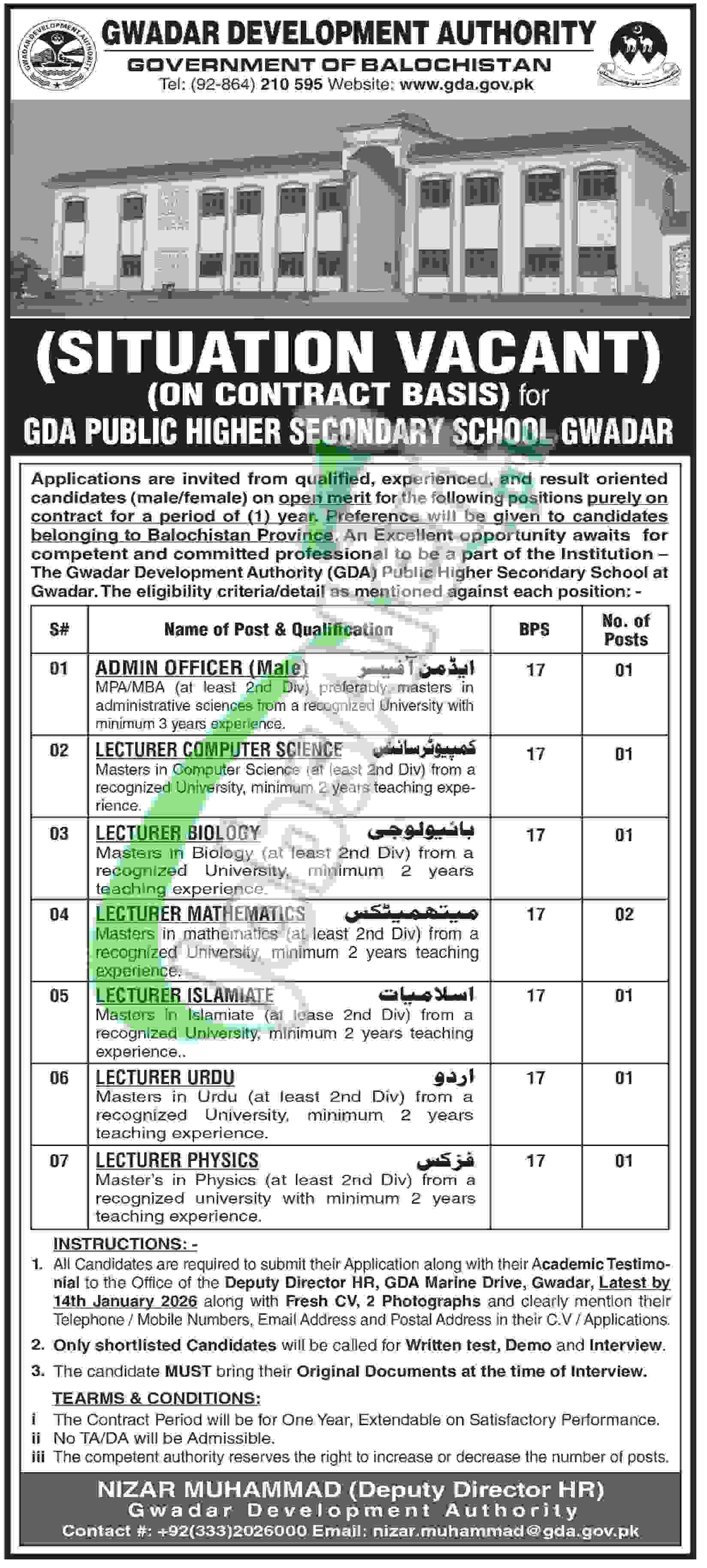 Find GDA Public Higher Secondary School Gwadar Jobs 2026 Latest Advertisement carries vacant posts named as (Admin Officer (Male) (BPS-17), Lecturer Computer Science (BPS-17), Lecturer Biology (BPS-17), Lecturer Mathematics (BPS-17), Lecturer Islamiat (BPS-17), Lecturer Urdu (BPS-17), Lecturer Physics (BPS-17)) for which candidates possessing qualification MPA / MBA / Master’s in Computer Science / Biology / Mathematics / Islamiat / Urdu / Physics with relevant experience holders are welcome to apply before the closing date 14th January 2026.