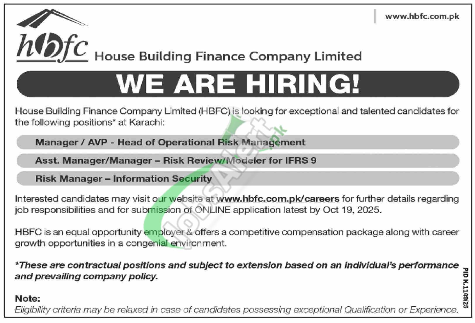 Visit www.hbfc.com.pk/jobs to Join House Building Finance Company Limited Jobs 2025 and the posts to apply are named as (Manager / AVP - Head of Operational Risk Management, Asst. Manager - Risk Review / Modeler for IFRS 9, Risk Manager - Information Security). Candidates possessing qualification Masters / Bachelor's in the relevant discipline with relevant experience holders are welcome to apply online before the last date 19th October 2025.