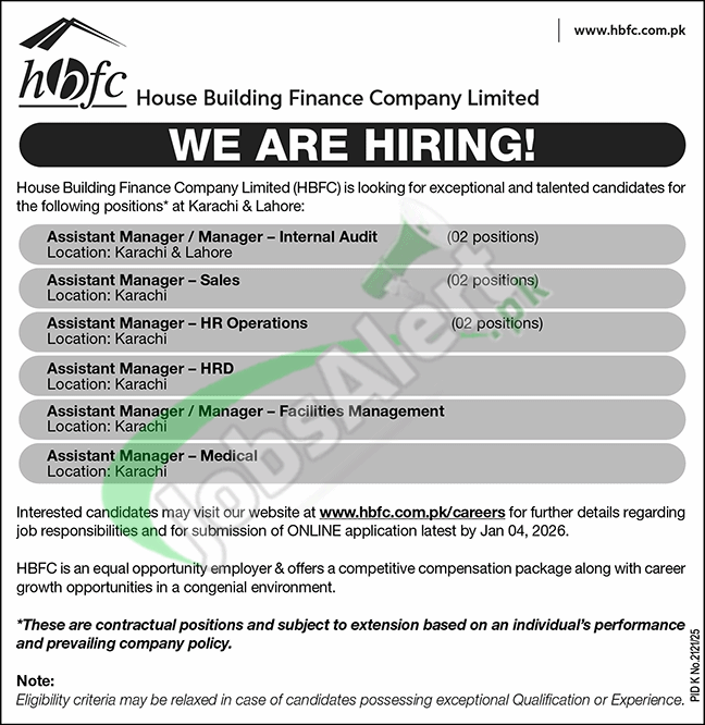 Visit www.hbfc.com.pk/careers to Join House Building Finance Company Limited Jobs 2026 and the posts to apply are named as (Assistant Manager / Manager – Internal Audit, Assistant Manager – Sales, Assistant Manager – HR Operations, Assistant Manager – HRD, Assistant Manager / Manager – Facilities Management, Assistant Manager – Medical). Candidates possessing qualification Master's / Bachelor's in the relevant discipline with relevant experience holders are welcome to apply online before the last date 04th January 2026.