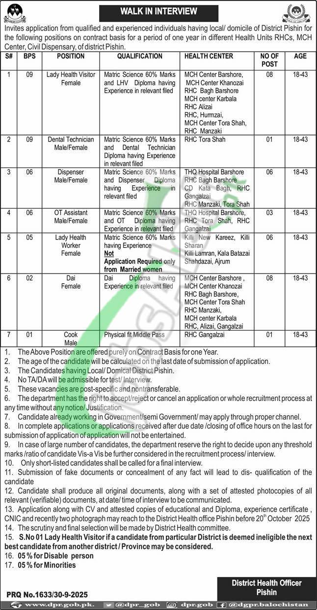 Find Health Department Pishin Jobs 2025 Employment Offers named as (Lady Health Visitor (BPS-09), Dental Technician (BPS-09), Dispenser (BPS-06), OT Assistant (BPS-06), Lady Health Worker (BPS-05), Dai (BPS-02), Cook (BPS-01)). Candidates possessing qualification Matric / Middle with relevant skills holders are welcome to apply before the last date 20th October 2025.