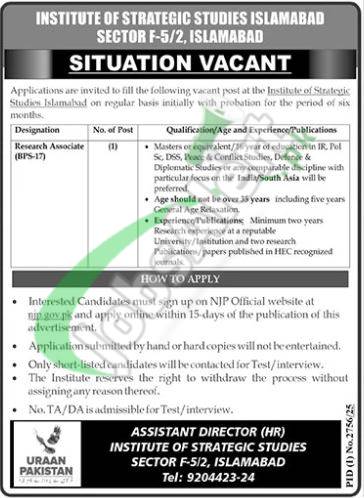 Find Online Apply Institute of Strategic Studies Jobs 2025 carries vacant posts named as (Research Associate) for which candidates possessing qualification Masters in the relevant discipline with relevant experience holders are welcome to apply before the last date 20th October 2025.