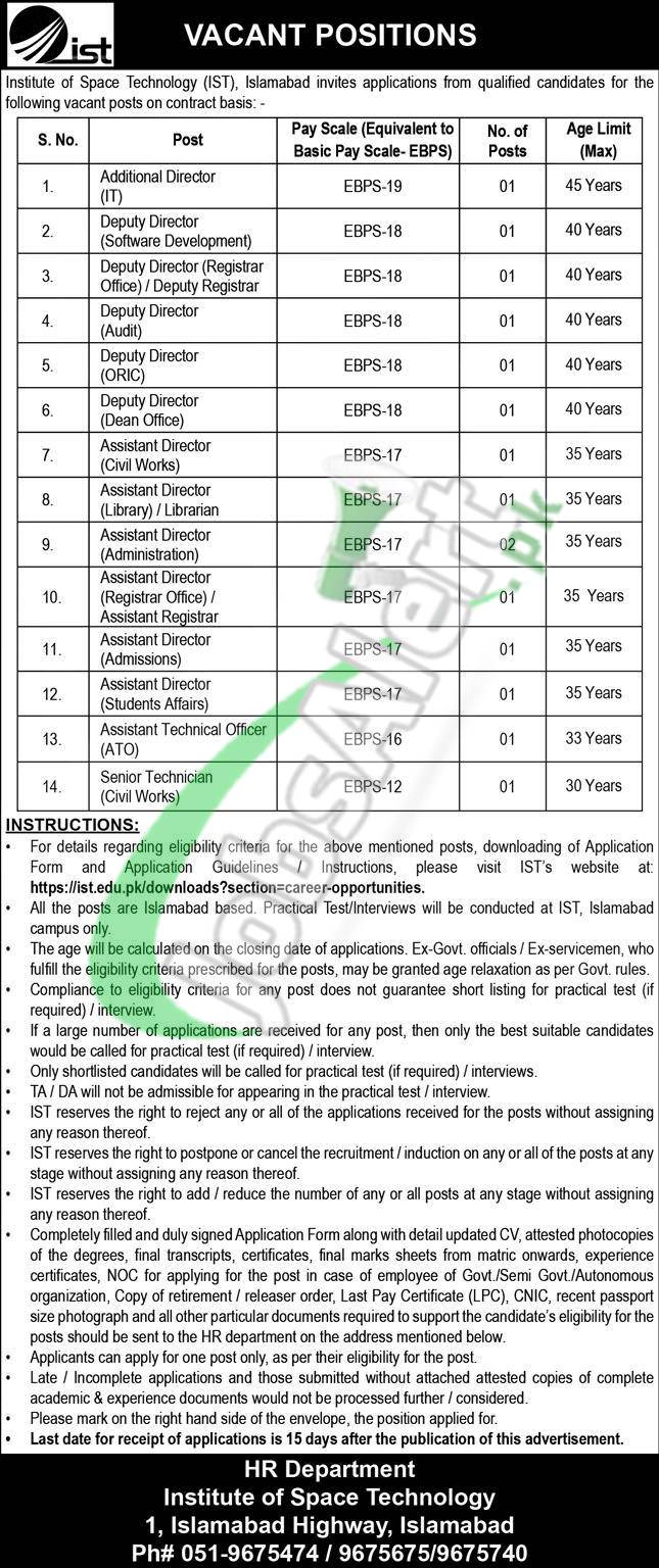Find Institute of Space Technology Jobs 2026 Apply Last Date for the posts named as (Additional Director (IT), Deputy Director (Software Development), Deputy Director (Registrar Office) / Deputy Registrar, Deputy Director (Audit), Deputy Director (ORIC), Deputy Director (Dean Office), Assistant Director (Civil Works), Assistant Director (Library) / Librarian, Assistant Director (Administration), Assistant Director (Registrar Office) / Assistant Registrar, Assistant Director (Admissions), Assistant Director (Students Affairs), Assistant Technical Officer (ATO), Senior Technician (Civil Works)). Candidates possessing qualification Master's / Bachelor's in the relevant discipline with relevant experience holders are welcome to apply online at IST Job Portal before the last date 30th January 2026.
