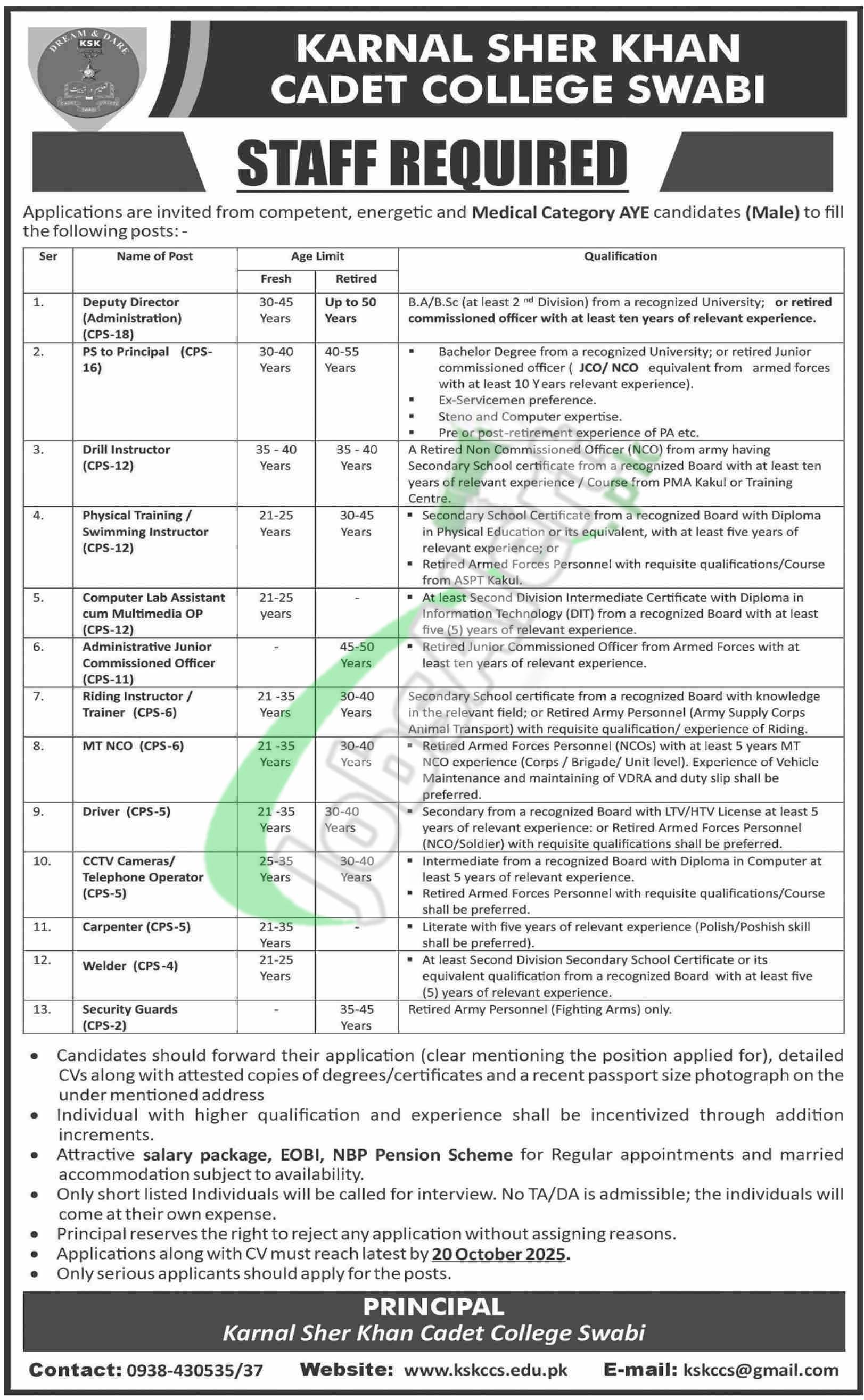 Find Cadet College Swabi Jobs 2025 Application Form for the posts named as (Deputy Director (Administration) (CPS-18), PS to Principal (CPS-16), Drill Instructor (BPS-12), Physical Training / Swimming Instructor (CPS-12), Computer Lab Assistant cum Multimedia OP CPS-12), Administrative Junior Commissioned Officer (CPS-11), Riding Instructor / Trainer (CPS-06), MT NCO (CPS-06), Driver (CPS-05), CCTV Cameras / Telephone Operator (CPS-05), Carpenter (CPS-05), Welder (CPS-04), Security Guards (CPS-02)). Candidates possessing qualification Bachelors / Intermediate / Matric with relevant experience holders are welcome to apply before the last date 20th October 2025.