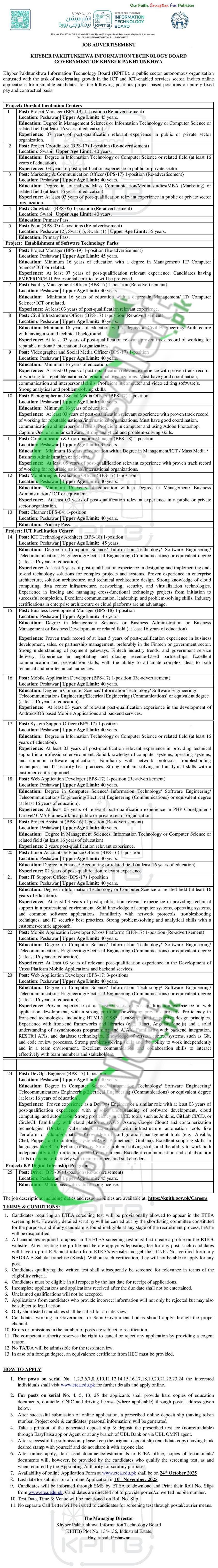 Find KPK Information & Technology Board Jobs 2025 KPITB Advertisement carries vacant posts named as (Durshal Incubation Centers (Project Manager, Project Coordinator, Marketing & Communication Officer, Chowkidar, Peon), Establishment of Software Technology Parks (Project Manager, Facility Management Officer, Civil Infrastructure Officer, Videographer and Social Media Officer, Photographer and Social Media Officer, Communication & Coordination Manager, Monitoring & Evaluation Officer, Cleaner), ICT Facilitation Center (ICT Technology Architect, Business Development Manager, Mobile Application Developer, System Support Officer, Web Application Developer, Project Assistant, Junior Accounts & Finance Officer, IT Support Officer, Mobile Application Developer (Cross Platform), DevOps Engineer), KP Digital Internship Program (Driver)). Candidates possessing qualification Masters to Matric with relevant experience holders are welcome to apply online at etea.online before the last date 10th November 2025.