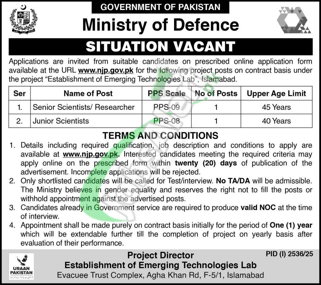 Find Ministry of Defence Jobs Online Apply 2025 njp.gov.pk for the posts named as (Senior Scientists / Researcher (PPS-09), Junior Scientists (PPS-08)) based at project titled Establishment of Emerging Technologies Lab, Islamabad. Candidates possessing qualification Masters / Bachelors / Intermediate with relevant experience holders are welcome to apply online at National Job Portal before the last date 18th October 2025.