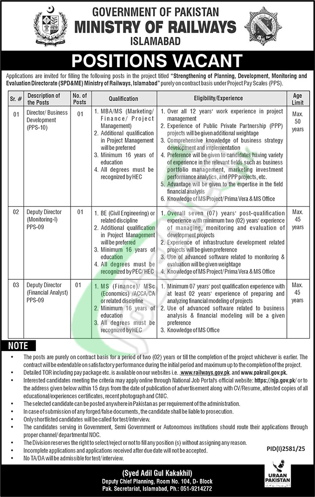 Find Pakistan Railways Jobs 2025 Online Applications for the posts named as (Director / Business Development (PPS-10), Deputy Director (Monitoring-I) (PPS-09), Deputy Director (Financial Analyst) (PPS-09)) based at project named as Strengthening of Planning, Development, Monitoring and Evaluation Directorate (SPD&ME), Ministry of Railways, Islamabad. Candidates possessing qualification MBA / MS / MSc / ACCA / CA / BE with relevant experience holders are welcome to apply online at www.njp.gov.pk before the last date 13th October 2025.
