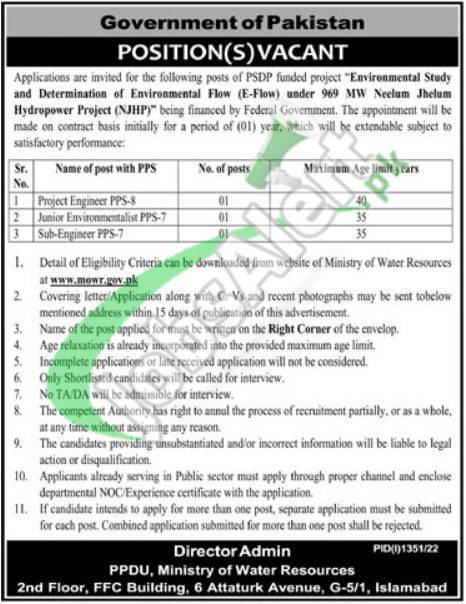 Find Ministry of Water Resources Jobs Application Form Download 2022 for the vacancies named as Project Engineer, Junior Environmentalist, Sub Engineer announced for the project named as Environmental Study and Determination of Environmental Flow (E-Flow) under 969 MW Neelum Jhelum Hydropower Project (NJHP). Candidates possessing Masters / Bachelors in the relevant discipline with relevant experience holders are welcome to apply before the last date 19th September 2022.