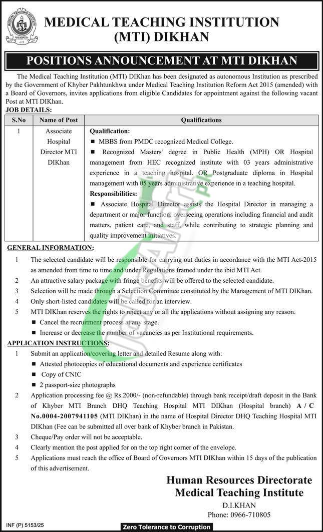 Find Medical Teaching Institution MTI DI Khan Jobs 2025 carries vacant posts named as (Associate Hospital Director) based at MBBS from PMDC Recognized Medical College with 03 to 05 years administrative experience. Candidates meeting criteria should apply before the last date 23rd December 2025.