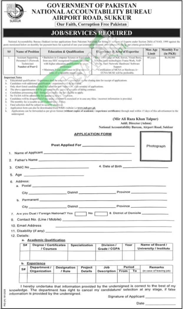 Visit nab.gov.pk to download application form for National Accountability Bureau Jobs named as (Assistant Supporting Personnel-I (Network Technician) based at Sukkur for which candidates possessing qualification Bachelors in Computer Sciences from a recognized institute with relevant experience holders are welcome to apply before the last date 03rd December 2025.