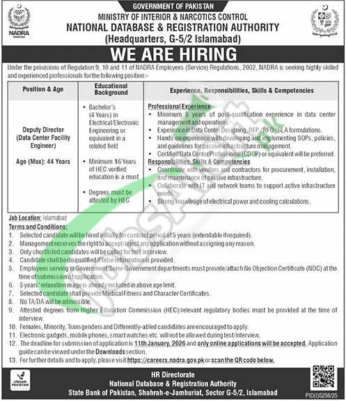 Find National Database and Registration Authority Jobs in Islamabad 2026 named as (Deputy Director (Data Center Facility Engineer)). Candidates possessing qualification Bachelor’s in Electrical / Electronic Engineering from a recognized institute with relevant experience holders are welcome to apply online at NADRA job Portal before the last date 11th January 2026.