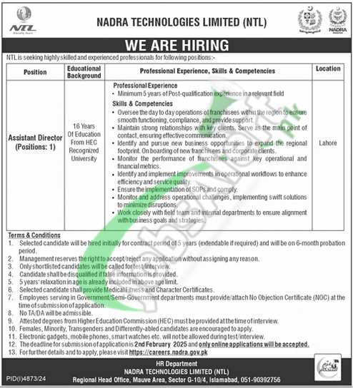 Visit careers.nadra.gov.pk for NADRA Technologies Limited Online Apply 2025 Last Date is 02nd Feb 2025 for the vacant posts named as (Assistant Manager) for which candidates possessing qualification Masters from a recognized university with relevant experience holders are welcome to apply online at Nadra Job Portal before the closing date 02nd February 2025.