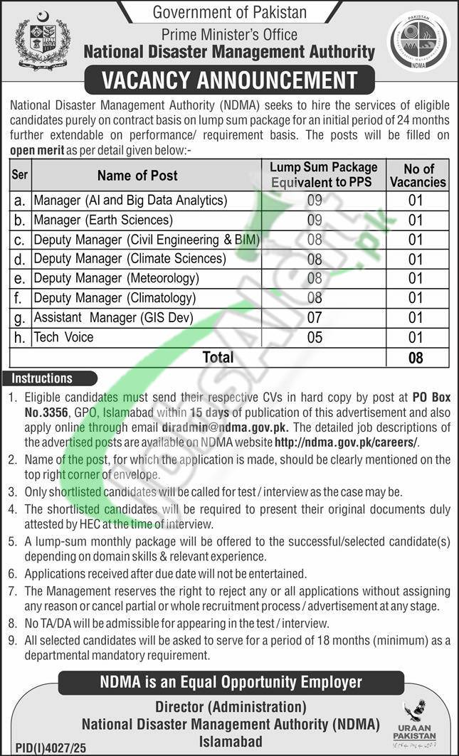 | Title: | NDMA Jobs 2025 National Disaster Management Authority Islamabad Pakistan |