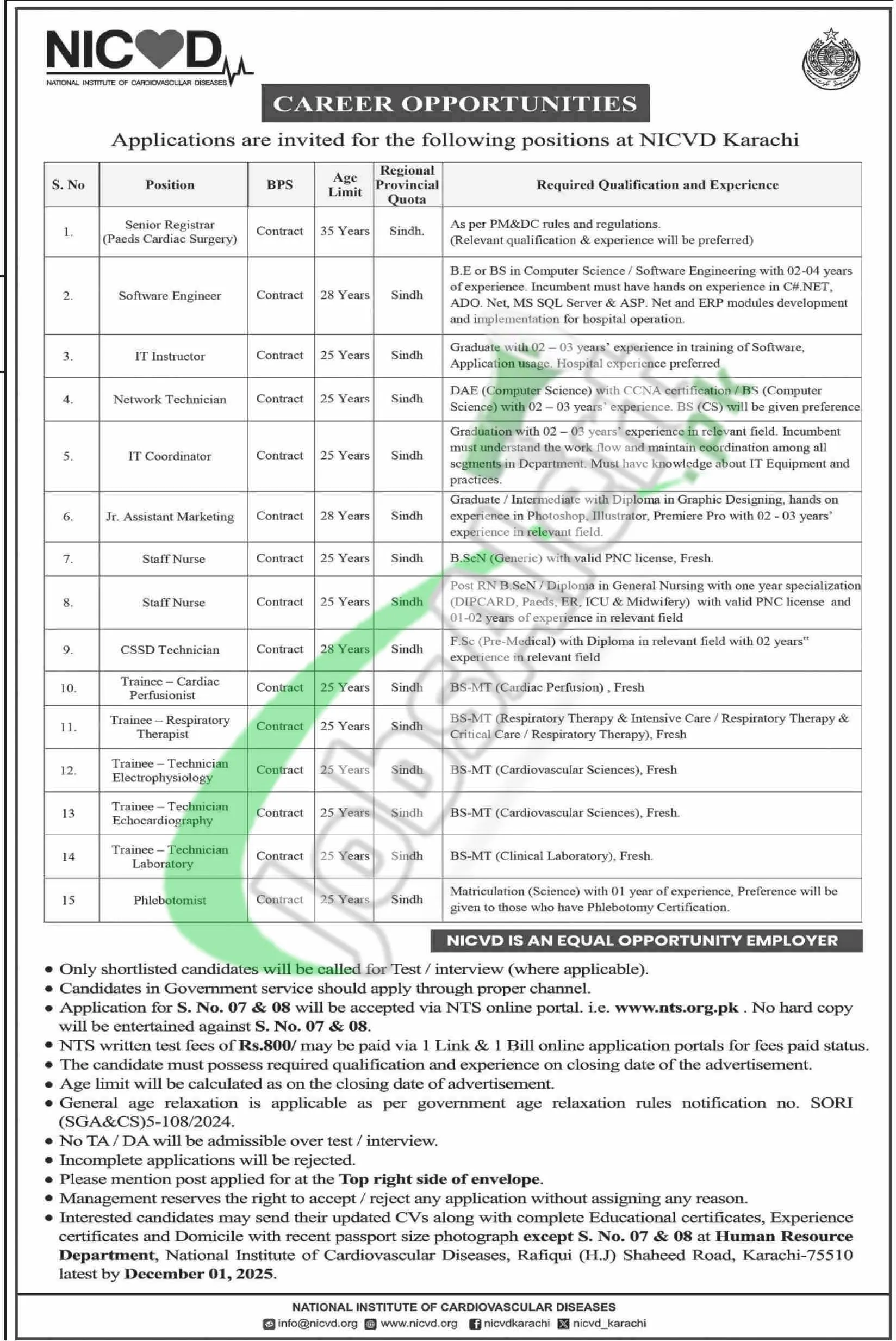 Find National Institute of Cardiovascular Diseases Current Vacancies named as (Senior Registrar (Paeds Cardiac Surgery), Software Engineer, IT Instructor, Network Technician, IT Coordinator, Jr. Assistant Marketing, Staff Nurse, CSSD Technician, Trainee – Cardiac Perfusionist, Trainee – Respiratory Therapist, Trainee – Technician Electrophysiology, Trainee – Technician Echocardiography, Trainee – Technician Laboratory, Phlebotomist) for which candidates possessing qualification Masters to Matric with relevant experience holders are welcome to apply before the last date 01st December 2025.