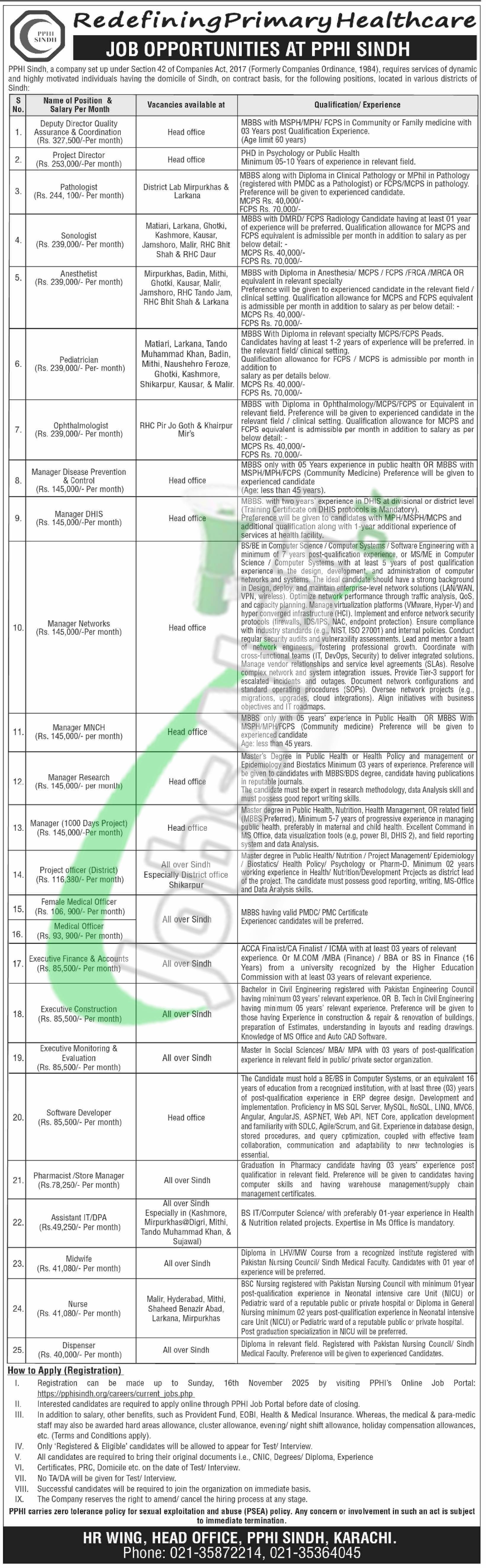 Find PPHI Sindh Jobs 2025 Current Offers named as (Deputy Director Quality Assurance & Coordination, Project Director, Pathologist, Sonologist, Anesthetist, Pediatrician, Ophthalmologist, Manager Disease Prevention & Control, Manager DHIS, Manager Networks, Manager MNCH, Manager Research, Manager (1000 Days Project), Project Officer (District), Female Medical Officer, Medical Officer, Executive Finance & Accounts, Executive Construction, Executive Monitoring & Evaluation, Software Developer, Pharmacist / Store Manager, Assistant IT/DPA, Midwife, Nurse, Dispenser) based at different districts in Sindh. Candidates possessing qualification MBBS / MSPH / FCPS / MPH / PhD / MCPS / FRCA / MRCA / Master’s / MBA / MPA / ACCA / CA / ICMA / Bachelor’s / BSIT / BSCS / BE / BSC Nursing / Diploma in LHV/MW / Nursing Diploma with relevant experience holders are welcome to apply online at PPHI Portal before the last date 16th November 2025.