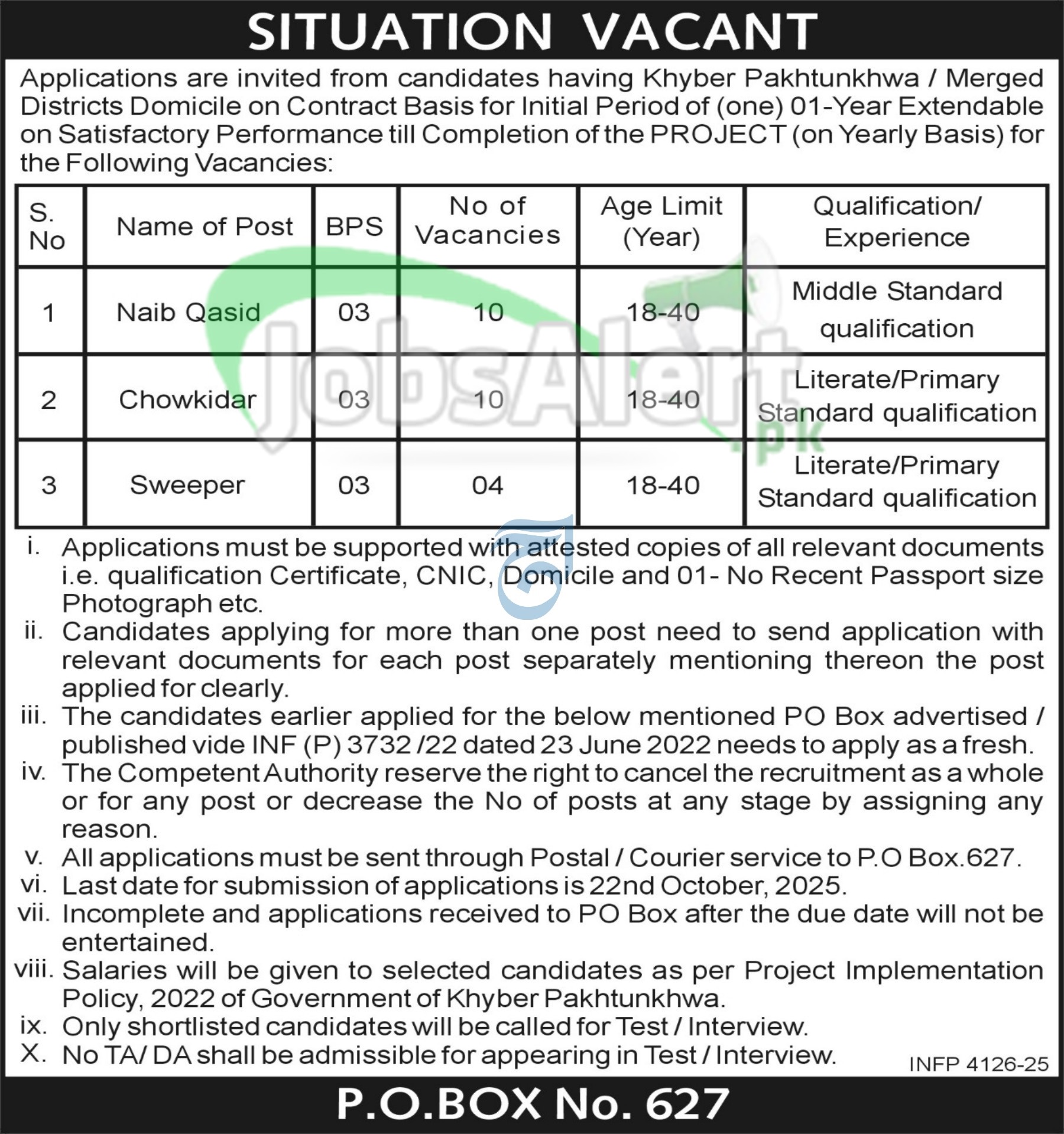 Find PO Box 627 Peshawar Jobs 2025 Public Sector Vacancies in KPK named as (Naib Qasid (BPS-03), Chowkidar (BPS-03), Sweeper (BPS-03)). Candidates possessing qualification Matric / Middle with relevant experience holders are welcome to apply before the last date 22nd October 2025.