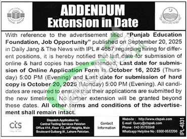 Punjab Education Foundation has extended last date for the PEF Jobs till October 20, 2025.