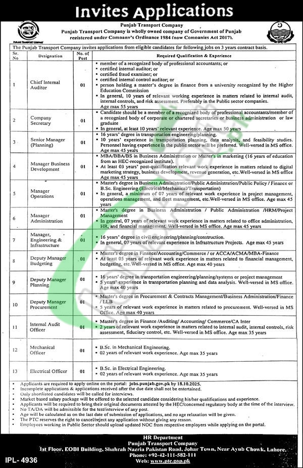 Find PTC Jobs Advertisement 2025 Punjab Transport Company Latest vacancies named as (Chief Internal Auditor, Company Secretary, Senior Manager (Planning), Manager Business Development, Manager Operations, Manager Administration, Manager Engineering & Infrastructure, Deputy Manager Budgeting, Deputy Manager Planning, Deputy Manager Procurement, Internal Audit Officer, Mechanical Officer, Electrical Officer). Candidates possessing qualification Masters / Bachelors in the relevant discipline with relevant experience holders are welcome to apply online at jobs.punjab.gov.pk before the last date 18th October 2025.