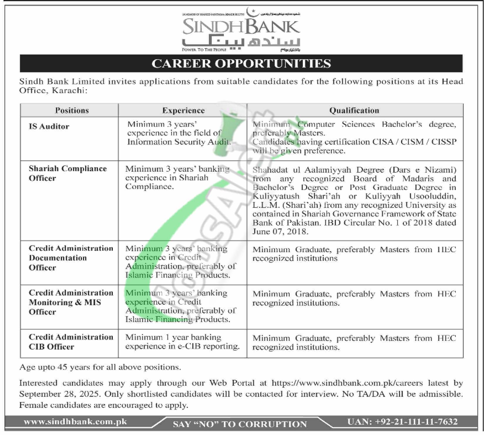 Find Latest Sindh Bank Jobs Online Apply 2025 for the posts named as (IS Auditor, Shariah Compliance Officer, Credit Administration Documentation Officer, Credit Administration Monitoring & MIS Officer, Credit Administration CIB Officer). Candidates possessing qualification Masters / LLM / BSCS / graduation with relevant experience holders are welcome to apply online at www.ssindhbank.com.pk before the last date 28th September 2025.