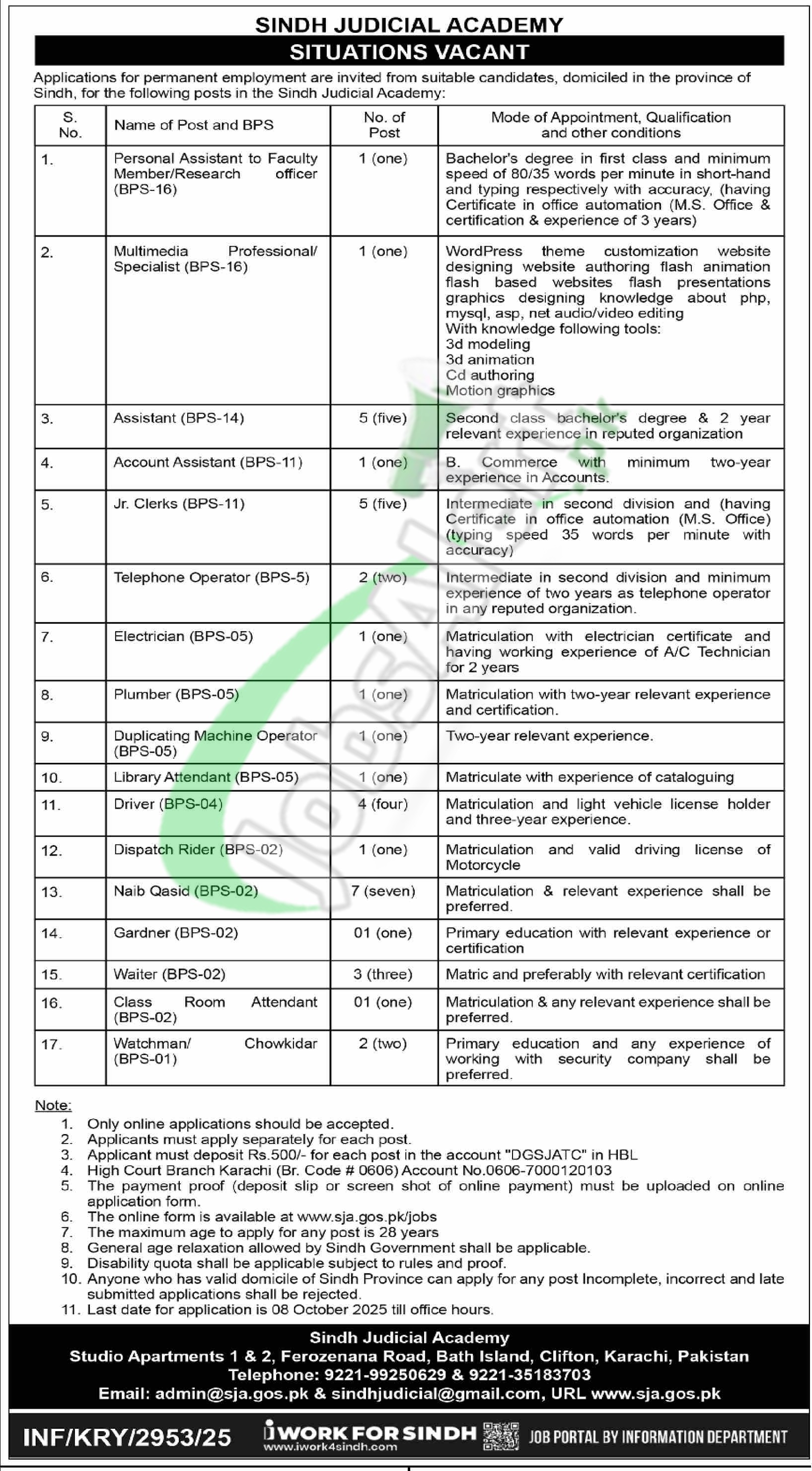 Find Sindh Judicial Academy Jobs Online Apply 2025 www.sja.gos.pk for the posts named as (Personal Assistant to Faculty Member / Research Officer (BPS-16), Multimedia Professional / Specialist (BPS-16), Assistant (BPS-14), Account Assistant (BPS-11), Junior Clerks (BPS-11), Telephone Operator (BPS-05), Electrician (BPS-05), Plumber (BPS-05), Duplicating Machine Operator (BPS-05), Library Attendant (BPS-05), Driver (BPS-04), Dispatch Rider (BPS-02), Naib Qasid (BPS-02), Gardner (BPS-02), Waiter (BPS-02), Class Room Attendant (BPS-02), Watchman / Chowkidar (BPS-01)). Candidates possessing qualification Bachelors to Matric are welcome to apply before the last date 08th October 2025.