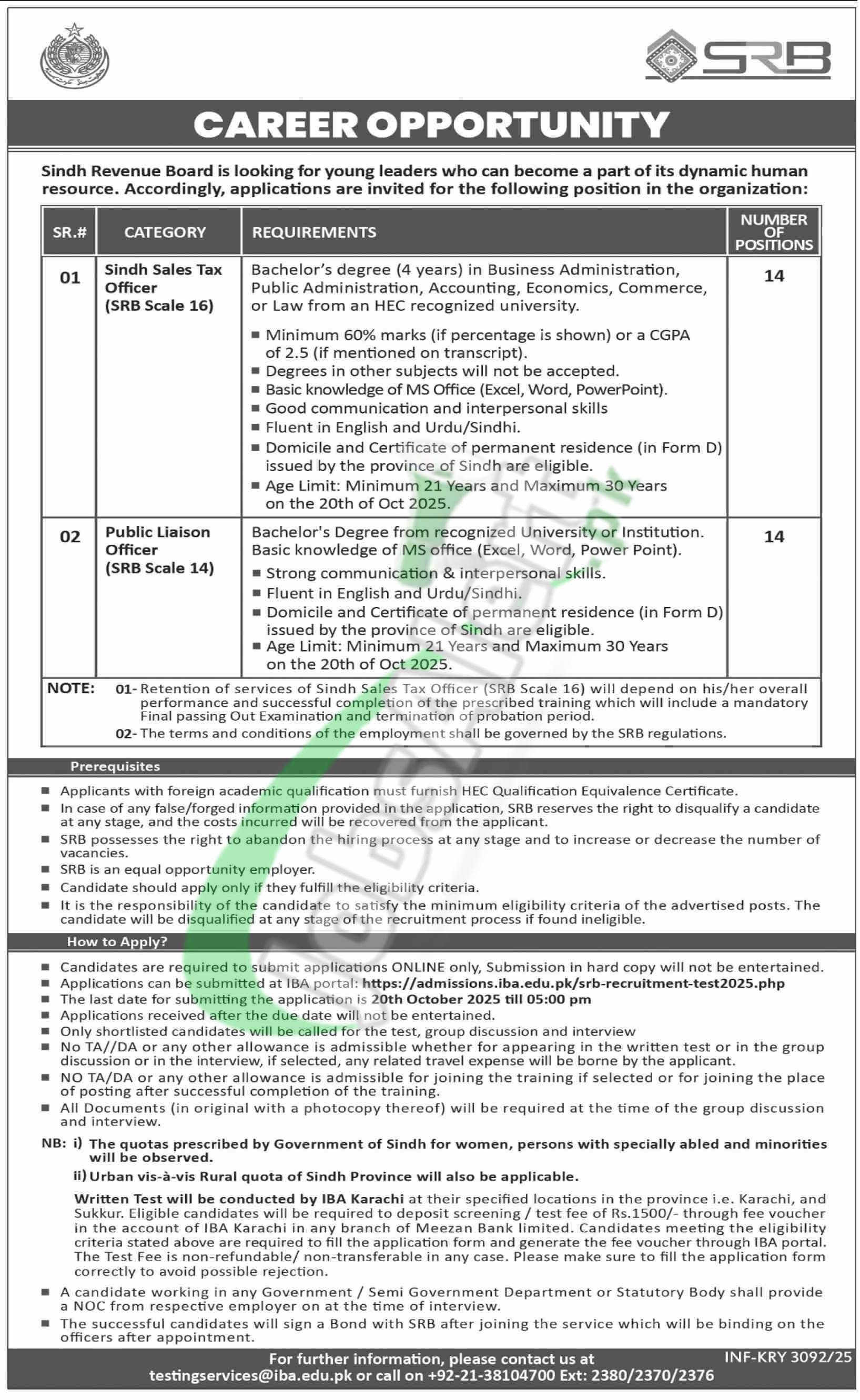 Visit https://admissions.iba.edu.pk/srb-recruitment-test2025.php for SRB Jobs 2025 Sindh Revenue Board Application Form Download for the posts named as (Sindh Sales Tax Officer (SRB Scale 16), Public Liaison Officer (SRB Scale 14)). Applicants possessing qualification Bachelor's degree in Business Administration, Public Administration, Accounting, Economics, Commerce, or Law from an HEC recognized university with 21 to 30 years age holders are welcome to apply online before the last date 20th October 2025.