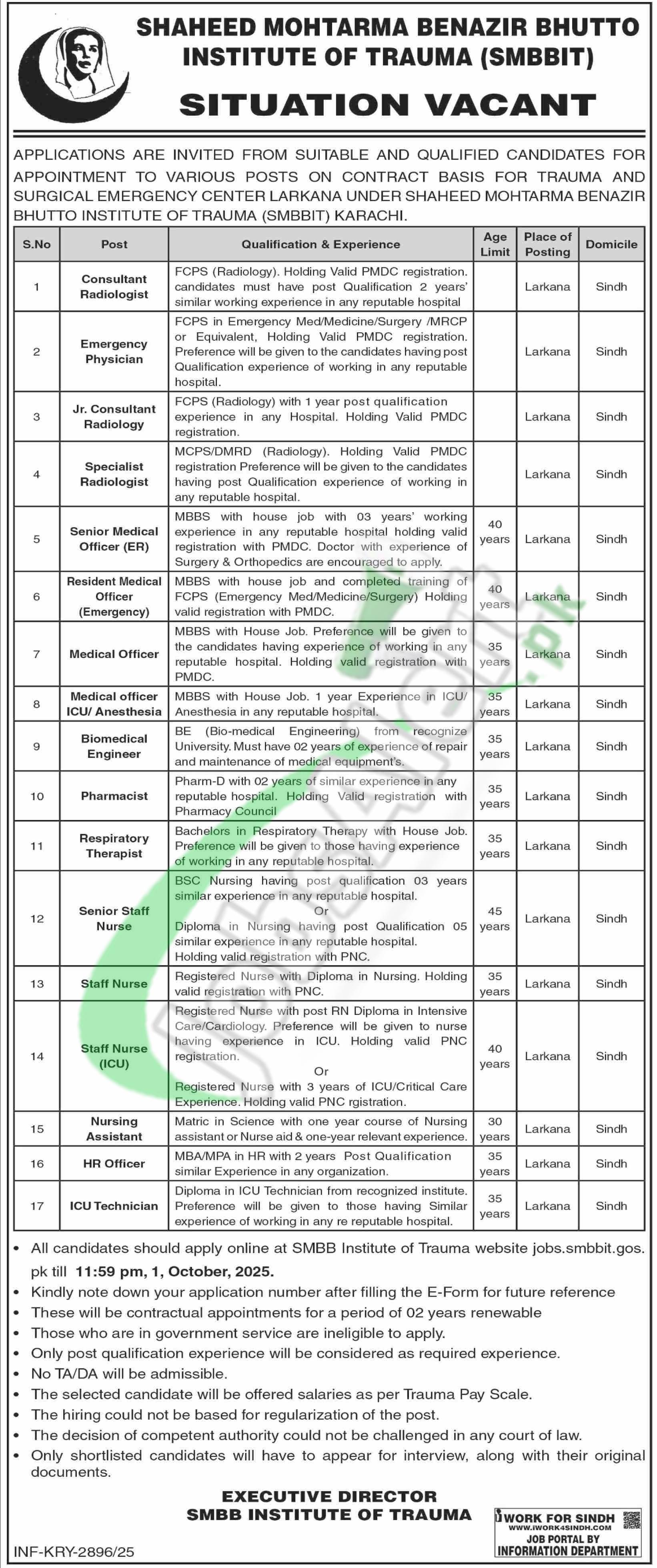 Title: | SMBB Trauma Centre Karachi Jobs 2025 Apply Online smbbit.gos.pk |
