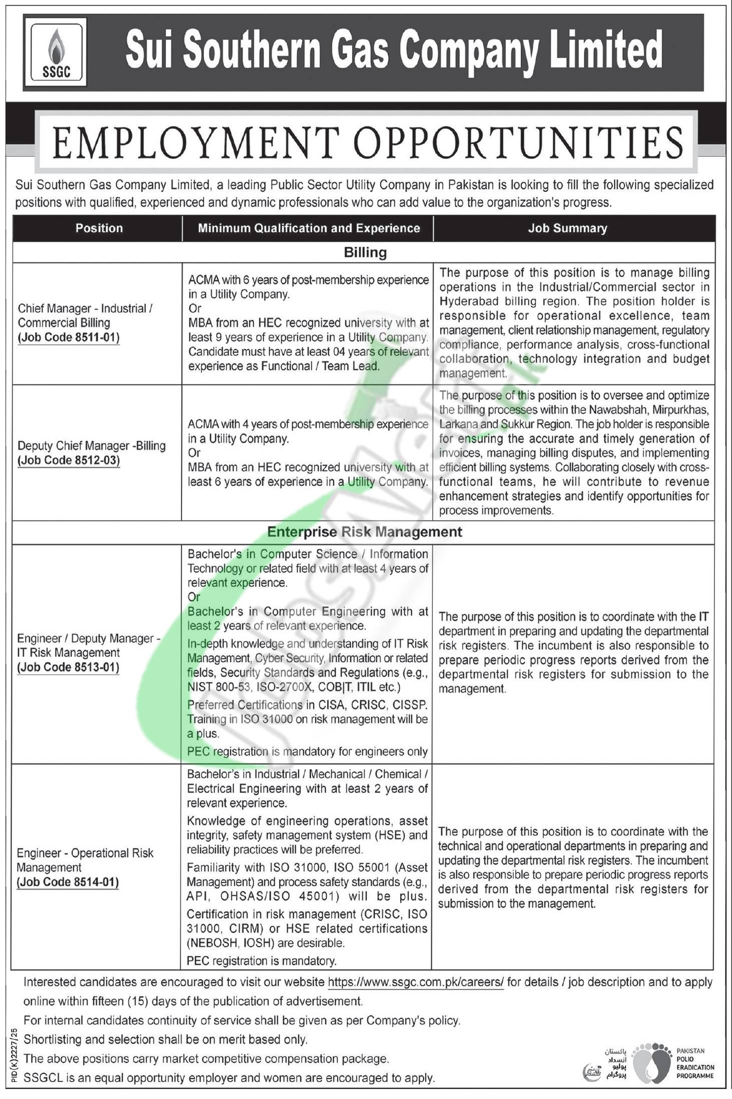 Find SSGC Jobs 2026 Sui Southern Gas Company carries vacant posts named as (Billing (Chief Manager – Industrial / Commercial Billing, Deputy Chief Manager – Billing), Enterprise Risk Management (Engineer / Deputy Manager – IT Risk Management, Engineer – Operational Risk Management)). Candidates possessing qualification ACMA / MBA / Bachelor’s in Computer Science / IT / Computer Engineering / Industrial / Mechanical / Chemical Electrical Engineering with 02 to 09 years relevant experience holders are welcome to apply online at ssgc.com.pk before the last date 12th January 2026.