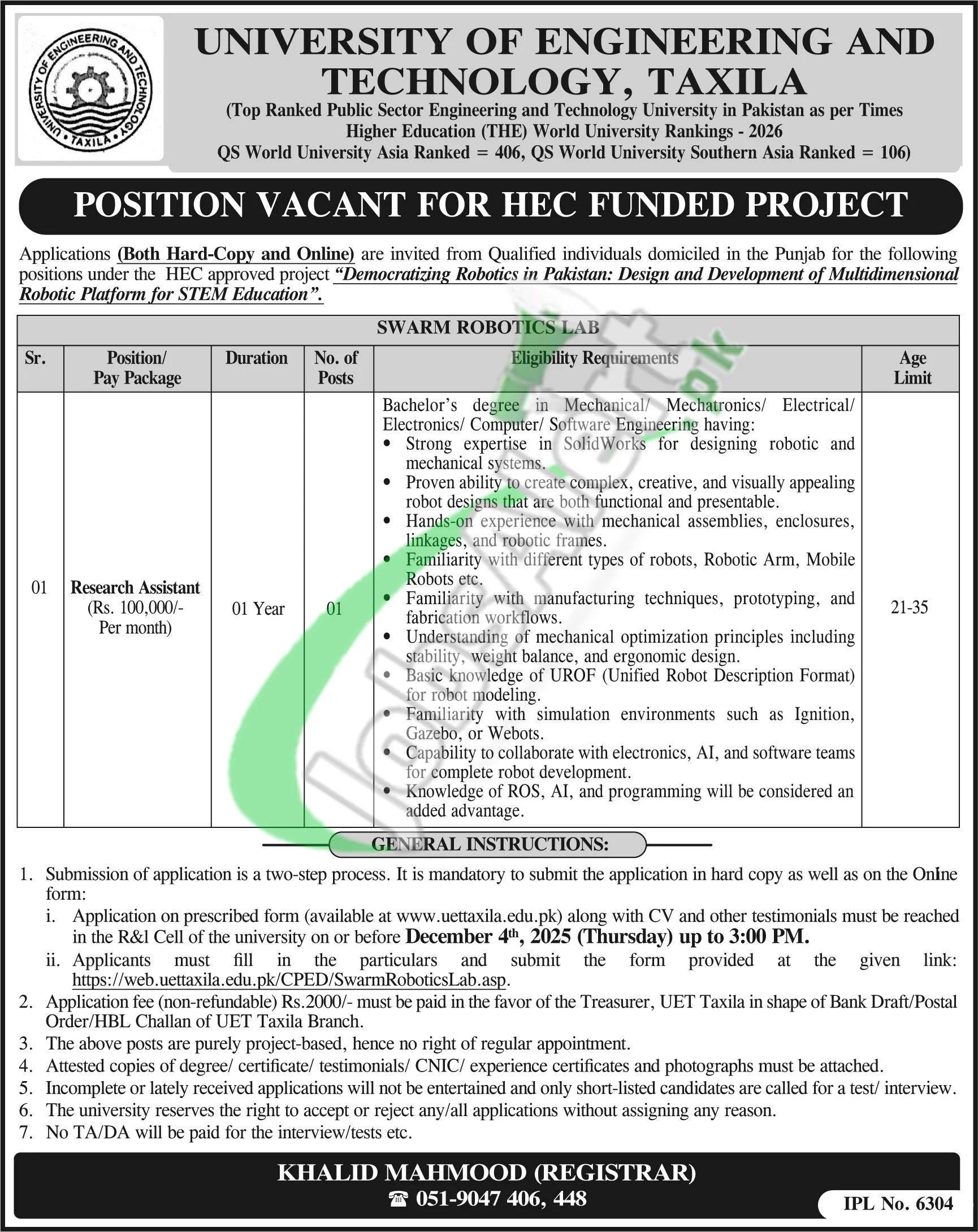 | Title: | UET Taxila Jobs 2025 – Research Assistant Application Form Download |