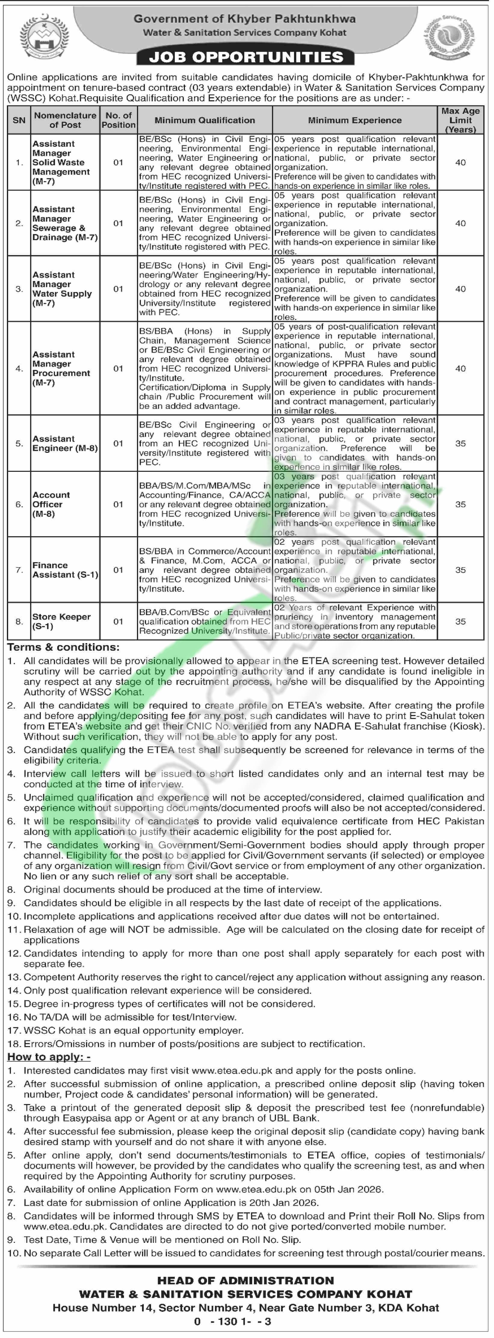 Find WSSC Kohat Jobs 2026 Water and Sanitation Services Form Online for the posts named as (Assistant Manager Solid Waste Management, Assistant Manager Sewerage & Drainage, Assistant Manager Water Supply, Assistant Manager Procurement, Assistant Engineer, Account Officer, Finance Assistant, Store Keeper). Candidates possessing qualification MBA / MSc / M.Com / CA / ACCA / BE / BSc / BS / BBA / B.Com with relevant experience holders are welcome to apply online at etea.edu.pk before the last date 20th January 2026.